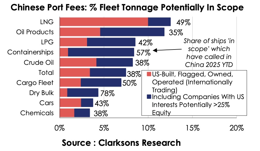 Clarksons Research analistleri, dünya yük tonajının %2 ila %7’sinin – filo sayısının ise %1 ila %3’ünün – bu yeni ücretlerden etkilenebileceğini hesaplıyor. Bu seviyenin genel olarak filo dağılımı ve rota değişiklikleriyle yönetilebilir olduğu, ancak kısa vadede piyasa dengesizlikleri ve kiralama tercihlerinde kaymalar yaratabileceği belirtiliyor.