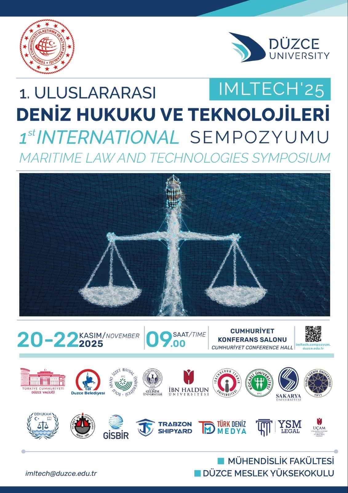 Düzce Üniversitesi'nin Ulaştırma ve Altyapı Bakanlığı iş birliğiyle 20-22 Kasım 2025 tarihlerinde düzenleyeceği 1. Uluslararası Deniz Hukuku ve Teknolojileri Sempozyumu (IMLTECH’25) ile denizcilik sektörünün önde gelen isimlerini bir araya getiriyor.